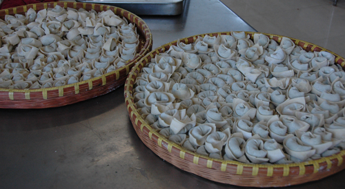 在其他員工的帶動下,新員工包得很認真,包起餛飩來可是相當(dāng)?shù)檬旖j(luò),短短幾秒鐘,一張一合,漂亮的餛飩就誕生了。