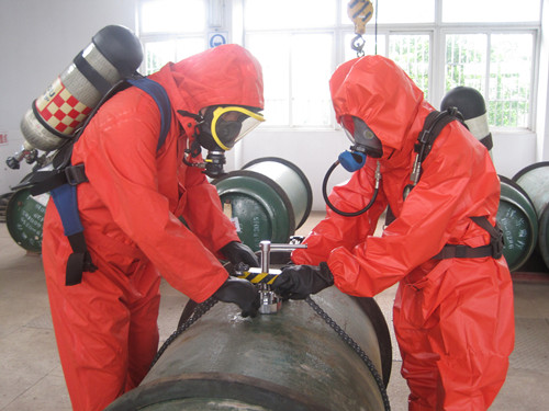 搶險人員迅速行動,穿好防護服,戴上防毒面具,熟練利用氨水尋找漏點,將壓罩罩在泄漏的針閥上,用動夾頭固定氯瓶保護圈……旋緊螺桿,壓緊壓罩,確保液氯處于密閉狀態(tài),搶險人員各司其職、緊張有序。 15分鐘后,液氯泄漏應(yīng)急處置完畢,演練順利結(jié)束。