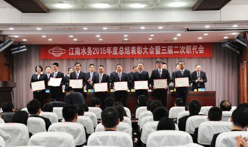 19日,公司在14樓會議室召開2015年度總結表彰大會暨三屆二次職代會。公司黨委書記、董事長龔國賢作講話,總經(jīng)理沙建新作題為《新起點 新征程 創(chuàng)新實干實現(xiàn)水務事業(yè)新跨越》的2015年度總結報告,并詳細部署2016年度工作,明確各項目標任務。會議由副總經(jīng)理高立主持。