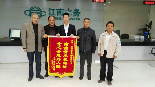 “滴滴清水表深情,全心全意為人民。”10月14日,臨港街道夏港社區(qū)六組的幾位村民代表來到夏港客服中心,以一面小小錦旗表達對江南水務(wù)的濃濃感激之情。