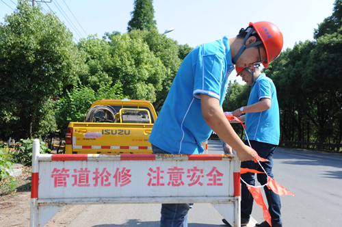 5月26日14點(diǎn)18分,市政工程公司搶修隊(duì)接到用戶的緊急電話:位于云顧路柳工道路機(jī)械有限公司附近綠化帶內(nèi)發(fā)生爆管。險(xiǎn)情就是命令。搶修隊(duì)接報(bào)后快速反應(yīng),迅速組織人員、車輛、設(shè)備趕赴現(xiàn)場(chǎng)。14點(diǎn)45分,搶修隊(duì)隊(duì)長(zhǎng)孫燕春、搶修一班和搶修四班相繼來(lái)到事發(fā)地點(diǎn),勘察現(xiàn)場(chǎng)具體情況,初步確認(rèn)是路東側(cè)綠化帶內(nèi)DN1000水泥管爆管,由于爆漏情況較為嚴(yán)重,估計(jì)將會(huì)造成該區(qū)大面積停水,結(jié)合現(xiàn)場(chǎng)情況,搶修人員一邊在爆管現(xiàn)場(chǎng)周邊進(jìn)行安全圍擋,一邊迅速進(jìn)行關(guān)閥止水,同時(shí)著手對(duì)外發(fā)布停水信息,并準(zhǔn)備向停水區(qū)域送水,搶修工作緊張有序地進(jìn)行。
